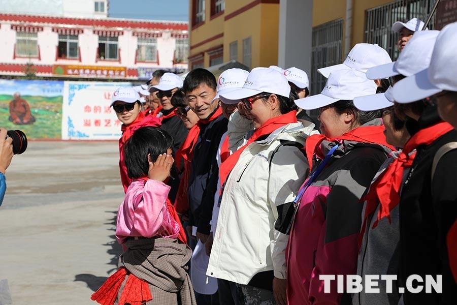 圖為瑪曲縣第一小學(xué)學(xué)生為專家佩戴紅領(lǐng)巾。