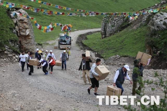 遇到車輛走不過去的地方,溫建民和同事們一起搬運藥品等。