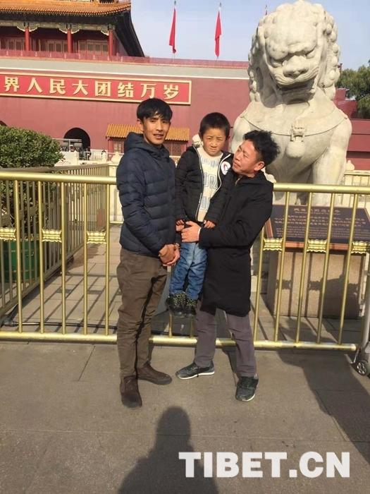 圖為丁子扎西父子在天安門前。 圖片由丁子扎西提供。