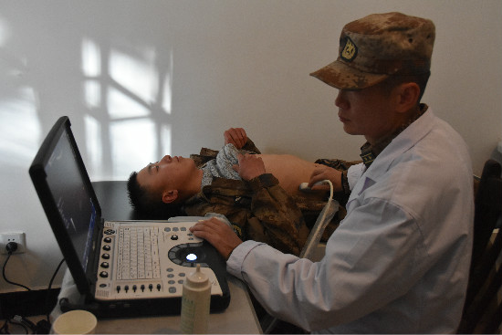 聽(tīng)說(shuō)陸軍九五六醫(yī)院前來(lái)巡診,官兵們?cè)缫训群蛟陂T(mén)外。查體、量血壓、做彩超……醫(yī)療隊(duì)員們耐心地詢(xún)問(wèn)官兵的身體狀況,為每個(gè)官兵做詳細(xì)的體檢。