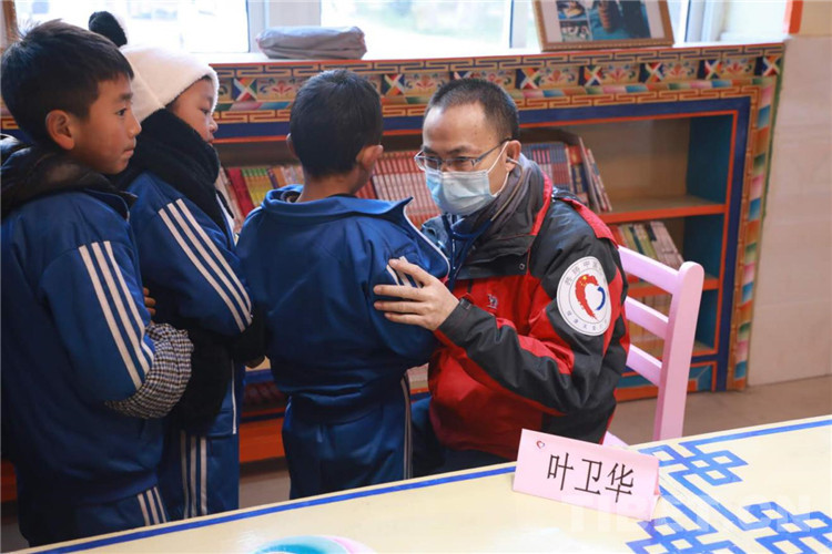 圖為解放軍總醫(yī)院心臟外科葉衛(wèi)華為當(dāng)?shù)貙W(xué)生聽(tīng)診篩查