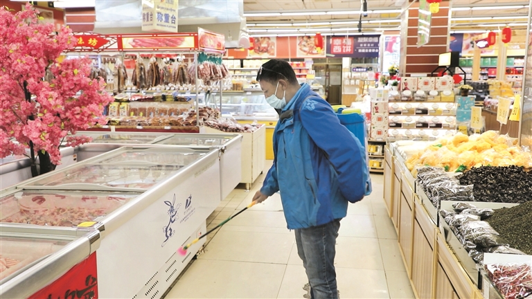 圖為超市工作人員對(duì)冷凍生鮮食品區(qū)進(jìn)行消毒殺菌工作。記者 拉珍 攝