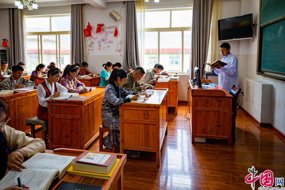 西藏藏醫(yī)藥大學(xué)建校之初,僅有1個(gè)藏醫(yī)學(xué)專(zhuān)業(yè)。隨后2001年設(shè)置藏藥專(zhuān)業(yè),2018年設(shè)置護(hù)理學(xué)和市場(chǎng)營(yíng)銷(xiāo)學(xué)專(zhuān)業(yè),2020年設(shè)置中(藏)西臨床醫(yī)學(xué)、中(藏)藥制藥專(zhuān)業(yè)。2019年藏醫(yī)學(xué)、藏藥學(xué)專(zhuān)業(yè)入選省級(jí)一流本科專(zhuān)業(yè)。2021年藏醫(yī)學(xué)入選國(guó)家級(jí)一流本科專(zhuān)業(yè)建設(shè)點(diǎn)。至此,學(xué)校形成了以藏醫(yī)學(xué)國(guó)家級(jí)一流本科專(zhuān)業(yè)建設(shè)點(diǎn)為引領(lǐng),以藏醫(yī)學(xué)、藏藥學(xué)2個(gè)省級(jí)一流專(zhuān)業(yè)建設(shè)點(diǎn)為支撐,以藏醫(yī)學(xué)、藏藥學(xué)、護(hù)理學(xué)、市場(chǎng)營(yíng)銷(xiāo)、中(藏)西臨床醫(yī)學(xué)、中(藏)藥制藥6個(gè)本科專(zhuān)業(yè)為基礎(chǔ)的發(fā)展新格局。圖為西藏藏醫(yī)藥大學(xué)學(xué)生正在上課。中國(guó)網(wǎng)記者 鄭亮攝