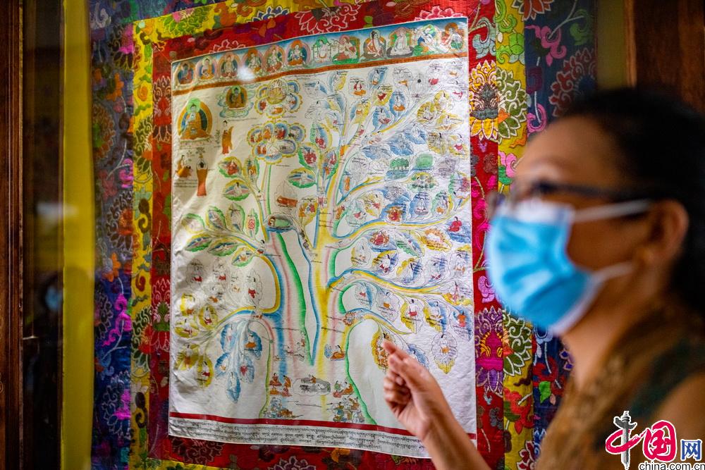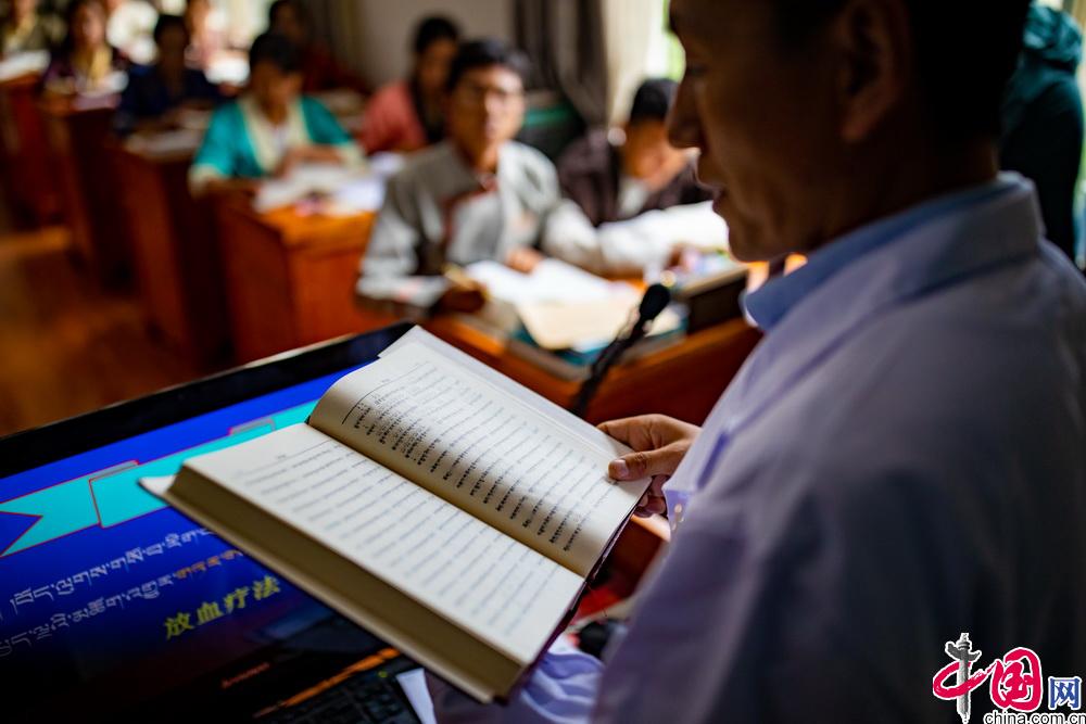 西藏藏醫(yī)藥大學(xué)開(kāi)設(shè)特色鮮明的藏醫(yī)藥學(xué)唐卡教學(xué)課程?,F(xiàn)有醫(yī)學(xué)唐卡由十七世紀(jì)藏醫(yī)藥大家第司.桑杰嘉措創(chuàng)建,距今已有300多年的歷史。醫(yī)學(xué)唐卡用歸納、總結(jié)的方式將藏醫(yī)藥典籍《四部醫(yī)典》的主要內(nèi)容以“樹(shù)喻”方式繪示出來(lái)。成書(shū)于1300多年的《四部醫(yī)典》是藏醫(yī)藥學(xué)理論的根本大典。包括總則醫(yī)典、論述醫(yī)典、秘訣醫(yī)典和后續(xù)醫(yī)典。內(nèi)容涵蓋藏醫(yī)生理學(xué)、病理學(xué)、診斷學(xué)、治療學(xué)等基礎(chǔ)理論,細(xì)化了婦科、兒科、內(nèi)科、外傷等學(xué)科,包含了解剖學(xué)、護(hù)理學(xué)、藥學(xué)等眾多學(xué)科。圖為學(xué)校老師在對(duì)醫(yī)學(xué)唐卡進(jìn)行講解。中國(guó)網(wǎng)記者 鄭亮攝