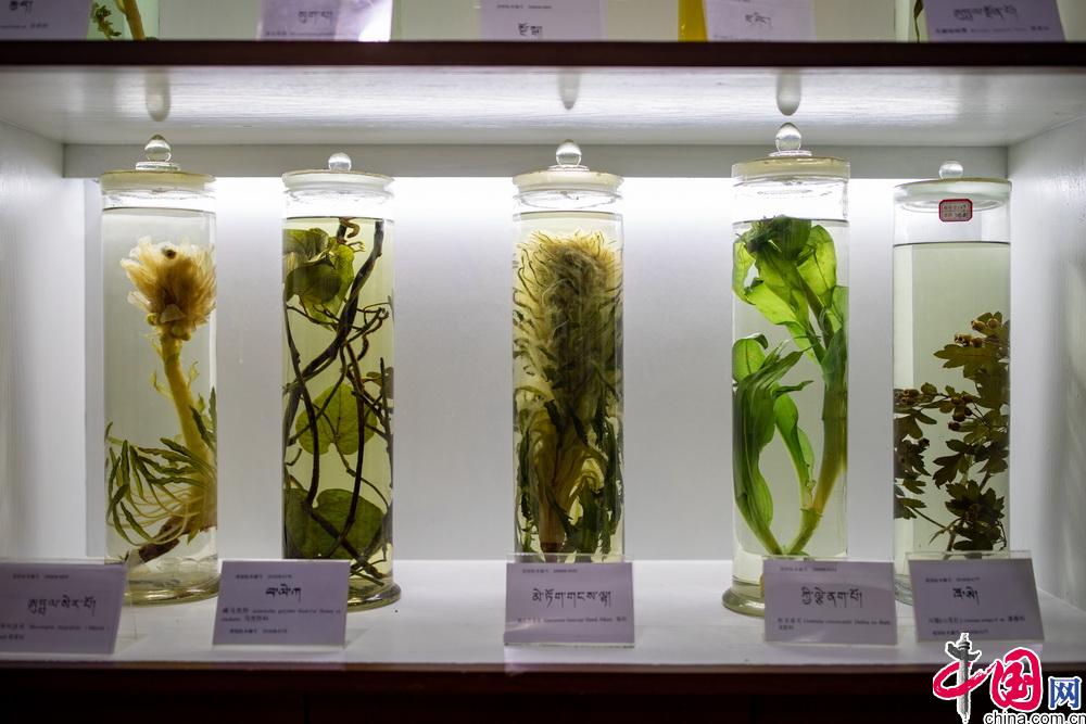學(xué)校目前在藏藥新藥研發(fā)方面正在進(jìn)行“四臣止咳液”、“降糖靈”、“清血康”等藏藥的研發(fā),同時(shí)研發(fā)出了藏藥牙膏、藏藥面膜等延伸產(chǎn)品。在藥材種植方面,積極開(kāi)展了瀕危藏藥材的種植攻關(guān)工作,先后對(duì)喜馬拉雅紫茉莉、 船形烏頭、紅景天等瀕危藏藥通過(guò)項(xiàng)目進(jìn)行育苗、種植等。圖為西藏藏醫(yī)藥大學(xué)內(nèi)所陳列的藏藥標(biāo)本。中國(guó)網(wǎng)記者 鄭亮攝