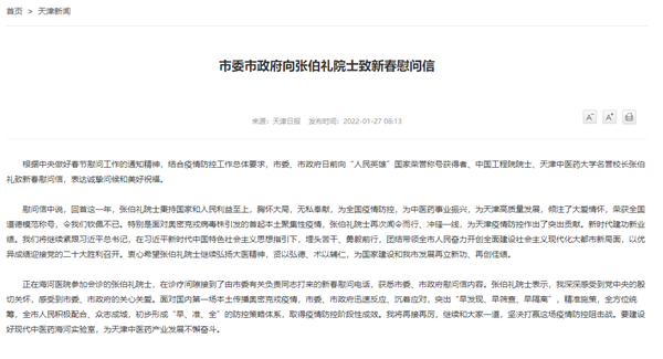 慰問(wèn)信中說(shuō),回首這一年,張伯禮院士秉持國(guó)家和人民利益至上,胸懷大局,無(wú)私奉獻(xiàn),為全國(guó)疫情防控,為中醫(yī)藥事業(yè)振興,為天津高質(zhì)量發(fā)展,傾注了大愛(ài)情懷,榮獲全國(guó)道德模范稱號(hào),令我們欽佩不已。特別是面對(duì)奧密克戎病毒株引發(fā)的首起本土聚集性疫情,張伯禮院士再次聞令而行、沖鋒一線,為天津疫情防控作出了突出貢獻(xiàn)。新時(shí)代建功新業(yè)績(jī)。