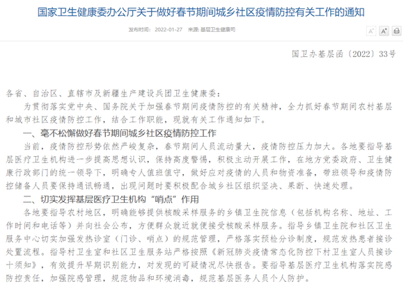 《通知》提到,各地要指導基層醫(yī)療衛(wèi)生機構進一步提高思想認識,保持高度警惕,積極主動開展工作,在地方黨委政府、衛(wèi)生健康行政部門的統(tǒng)一領導下,毫不松懈做好春節(jié)期間城鄉(xiāng)社區(qū)疫情防控工作。