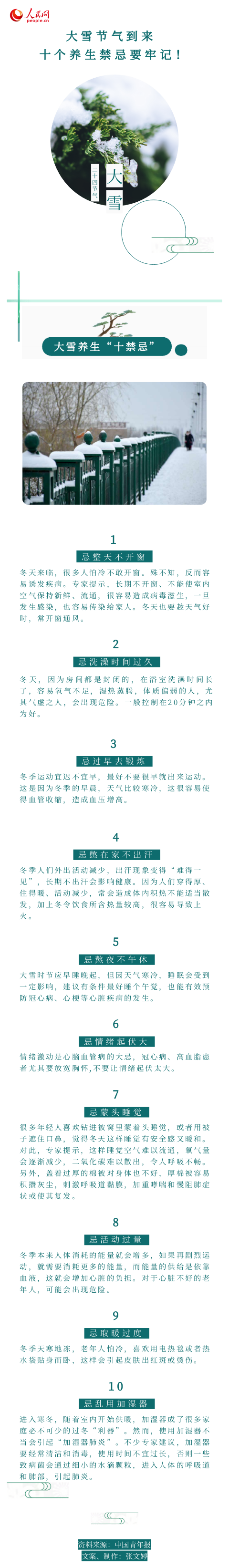 編者按:12月7日是農(nóng)歷二十四節(jié)氣中大雪節(jié)氣?!对铝钇呤蚣狻氛f:“大雪,十一月節(jié),至此而雪盛也。”“大雪”是冬季的第三個節(jié)氣,標(biāo)志著仲冬時節(jié)的正式開始。 俗話說“大雪進(jìn)補(bǔ),來年打虎”,大雪節(jié)氣后大家應(yīng)在養(yǎng)生方面注意什么呢?一圖告訴你!