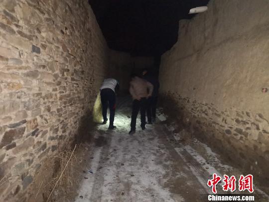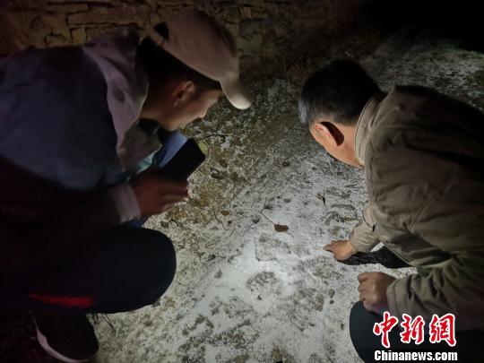 圖為青海省玉樹(shù)州稱多縣環(huán)境保護(hù)和林業(yè)局工作人員沿雪豹留下的腳印找尋蹤跡。 鐘欣 攝