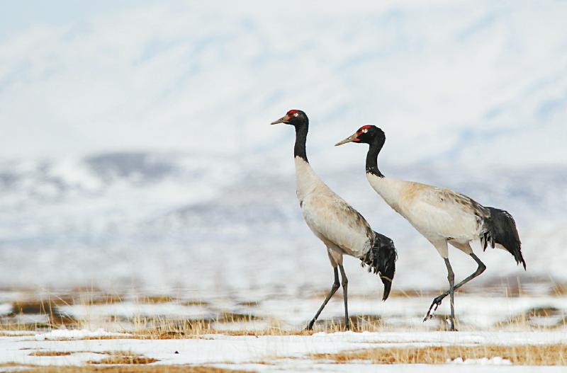 一對(duì)正在散步的黑頸鶴。
