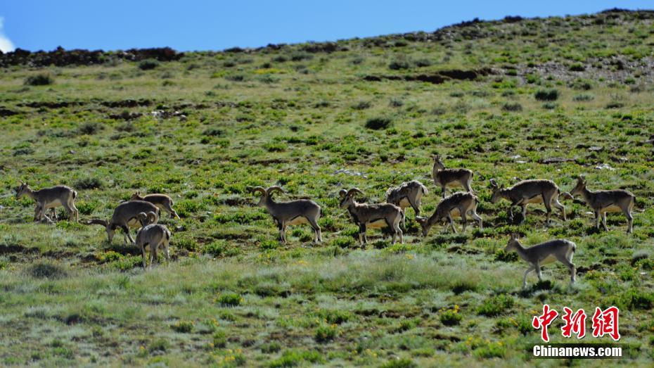 9月2日,多只藏原羚和巖羊在西藏山南羊卓雍錯(cuò)湖畔覓食。當(dāng)?shù)亟陙聿粩嗉哟蟊Wo(hù)力度,環(huán)境日益趨好,野生動物種群正在逐漸恢復(fù)、增長。中新社記者 江飛波 攝