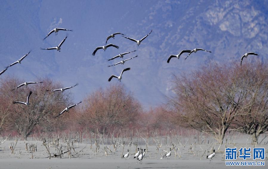 冬季,成群結(jié)隊的黑頸鶴遷徙到西藏林芝市,雅魯藏布江及江畔的農(nóng)田成了它們越冬的樂園。