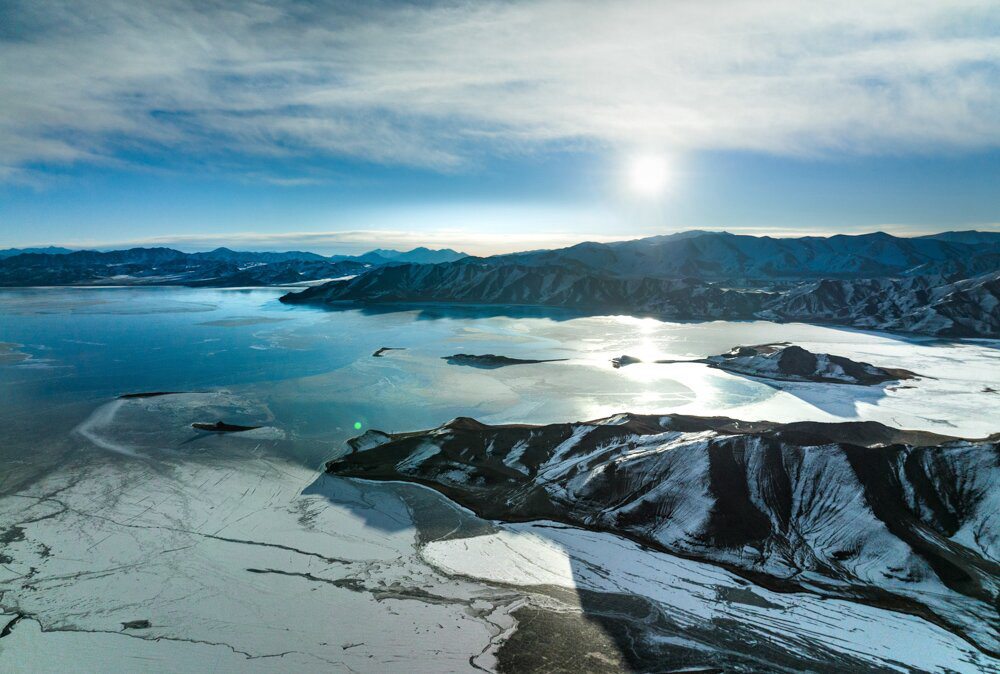 阿里日土縣境內(nèi)航拍拍攝冬季班公湖。