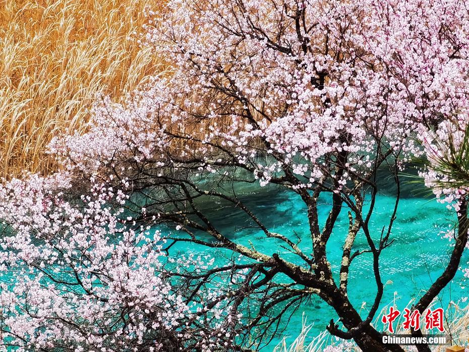 3月的九寨溝春回大地,暖陽怡人,遍布河谷、湖畔、山腰的九寨扁桃花迎風綻放,花期正當時。梁楓 攝