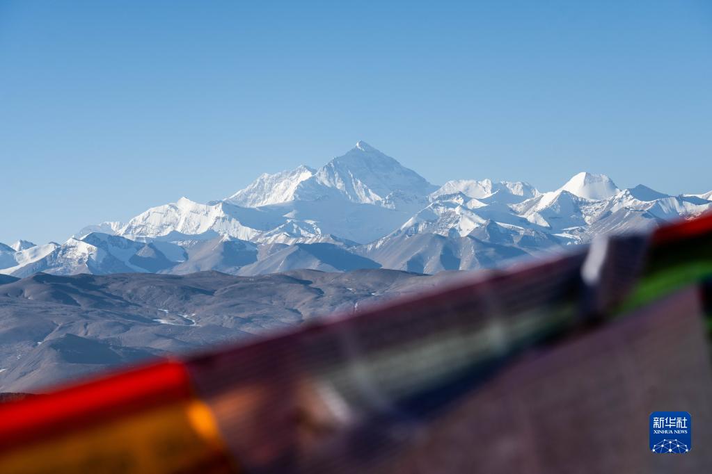 這是3月15日在西藏日喀則透過藍(lán)色經(jīng)幡拍攝的珠穆朗瑪峰。新華社記者 周荻瀟 攝
