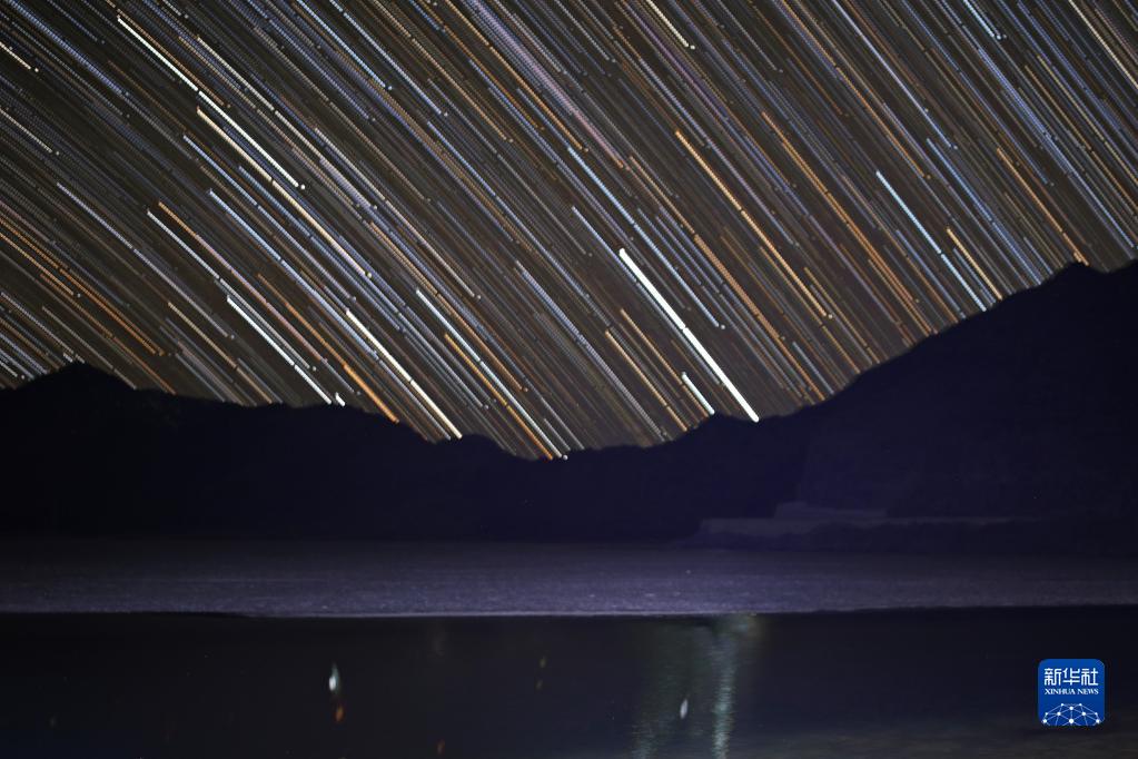 這是4月6日在班公湖畔拍攝的星軌(合成照片)。新華社記者 姜帆 攝