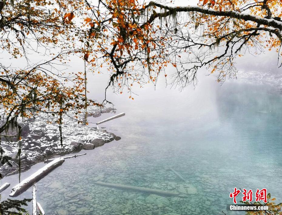 十月,九寨溝長(zhǎng)海、原始森林等景點(diǎn)迎來(lái)入秋后的第一場(chǎng)雪。澄凈碧藍(lán)的海子和金色的彩林與潔白的雪花相映相襯,構(gòu)成一幅靜謐的美麗畫卷。遠(yuǎn)遠(yuǎn)看去,成片的彩林被一朵朵雪花點(diǎn)綴,美得像童話世界一般。 梁峰 攝