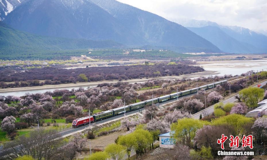 近日,中國鐵路青藏集團有限公司介紹,3月下旬至4月,拉林鐵路沿線綿延的野生桃花林盛開,藍天、白云、桃花、雪山、高原復(fù)興號動車等相互交織,形成了一幅幅美不勝收的畫面。圖為穿梭在桃花林中的拉林鐵路高原復(fù)興號。