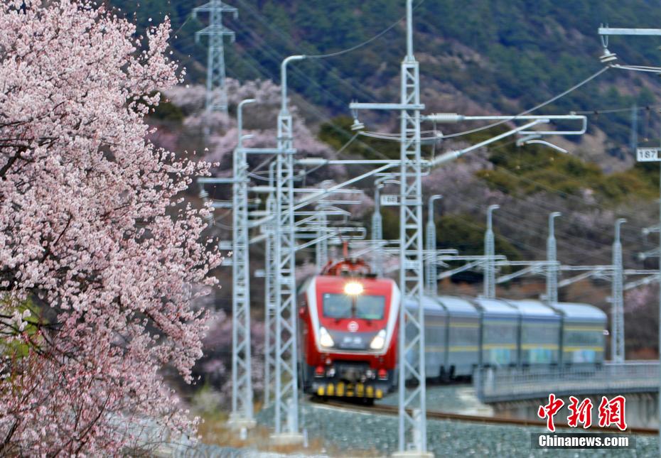 穿梭在桃花林中的拉林鐵路高原復(fù)興號。