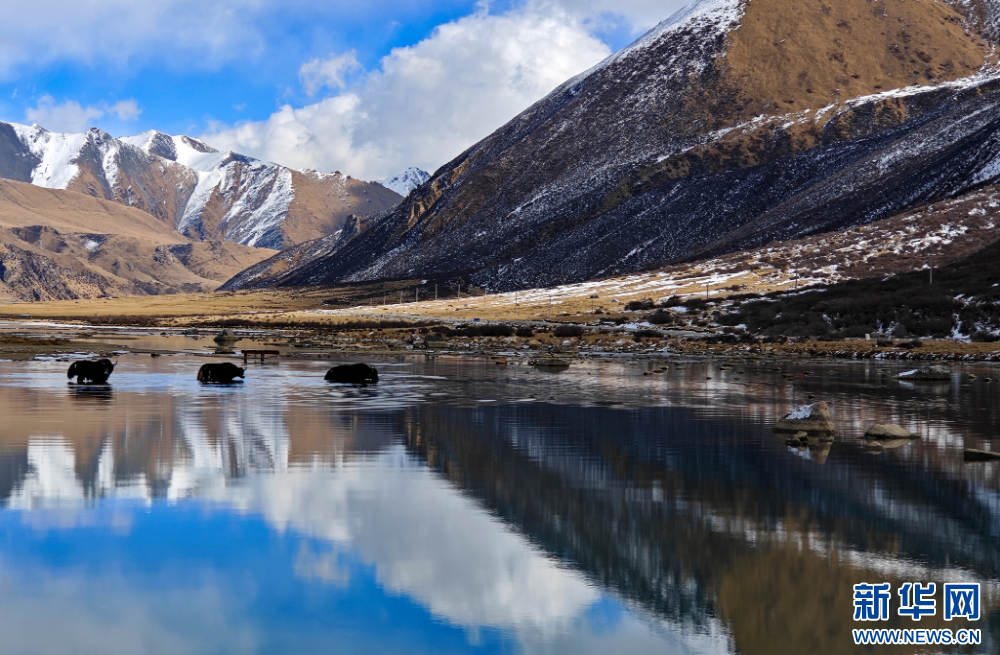 12月10日,在嘉乃玉錯湖邊拍攝的牦牛。新華網 旦增努布 攝