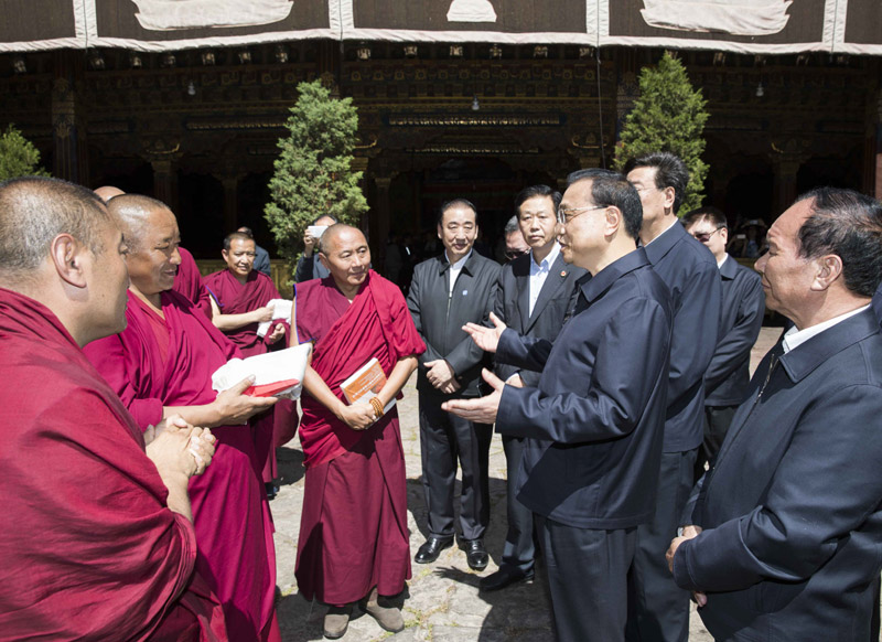 7月26日下午,李克強總理來到拉薩市大昭寺看望慰問西藏宗教界人士。始建于653年的大昭寺是西藏現(xiàn)存最輝煌的吐蕃時期寺廟建筑。李克強向西藏廣大宗教界人士致以誠摯的問候和衷心的祝福。他說,大昭寺是藏傳佛教的圣殿,同時見證了漢藏和親、民族團結(jié)的光輝歷史。希望西藏廣大宗教界愛國人士要以歷輩高僧大德為榜樣,為維護祖國統(tǒng)一、民族團結(jié)、社會和諧作出有益貢獻,促進宗教和睦、佛事和順、寺廟和諧。祝愿大家精修得道、身體健康、扎西德勒!