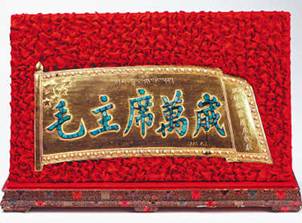 圖為金盾:毛主席萬(wàn)歲。1951年5月,十世班禪大師敬獻(xiàn)毛澤東主席的禮品。金盾主體部分的五星紅旗是銅質(zhì)鍍金,珍珠鑲嵌旗面周圍,綠松石鑲嵌字體,右側(cè)藏文為“班禪額爾德尼敬獻(xiàn)”。圖片來(lái)源:民族文化宮 許娜攝