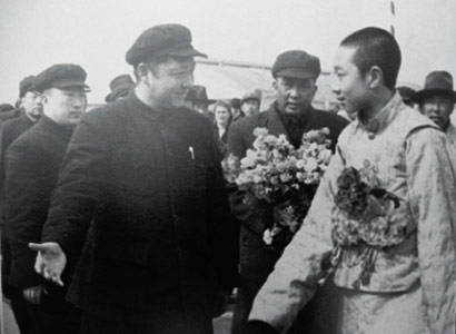 圖為1951年4月22日,習(xí)仲勛(前左)率領(lǐng)西北軍政代表熱烈歡迎途經(jīng)西安赴北京的十世班禪(前右)。圖片來(lái)源:《中國(guó)西藏》雜志