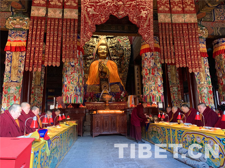 十一世班禪口念經(jīng)文,百余位僧人身著戒衣,按順序分坐于大殿兩側(cè),跟隨大師虔誠(chéng)詠誦《皈依發(fā)心》《文殊師利名贊》《十世班禪大師功德新祈禱詞》《回向祈禱詞》《十一世班禪大師常住世間法》《白度母贊》《釋教昌盛祈愿》,以及《興隆正法》《消除眾劫》《六時(shí)吉祥》等。