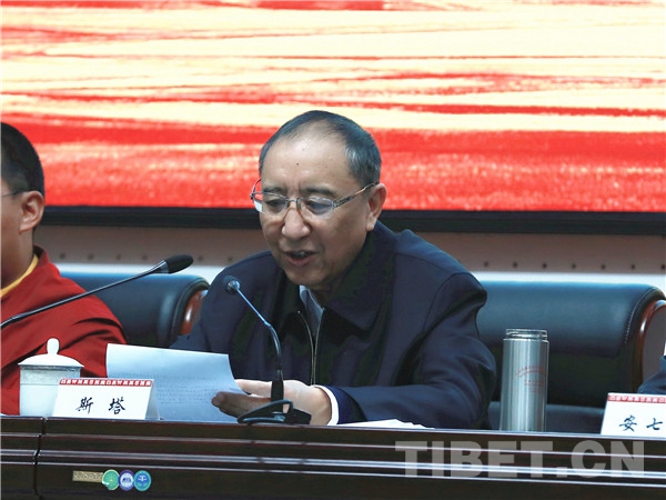 會議由中國藏學(xué)研究中心總干事鄭堆主持,中央統(tǒng)戰(zhàn)部斯塔同志、十一世班禪、中國佛教協(xié)會副會長演覺、中國佛教協(xié)會副會長祜巴等傣等先后講話。