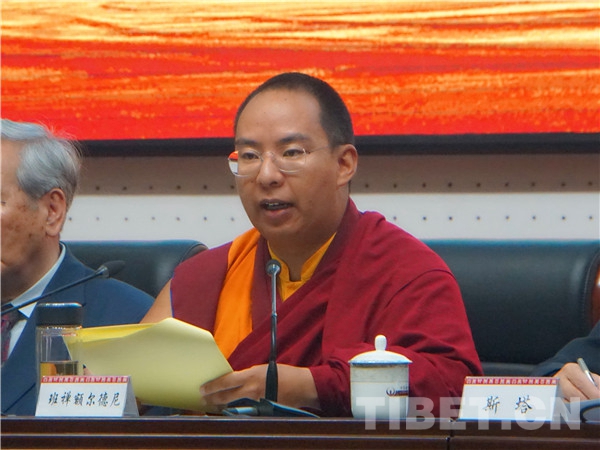 中國藏語系高級佛學(xué)院副院長土多申格、中央民族大學(xué)教授班班多杰、中國藏學(xué)研究中心研究員張?jiān)频认群蟀l(fā)言。各位學(xué)者專家分別就十世班禪大師的榜樣精神、從十世班禪大師轉(zhuǎn)世看活佛轉(zhuǎn)世的歷史定制、兩代班禪與青海師范大學(xué)間的特殊因緣、從扎什倫布寺民主管理試點(diǎn)等多角度多層次深入研討大師愛國愛教思想的博大精深,追思他功德業(yè)績的偉大。