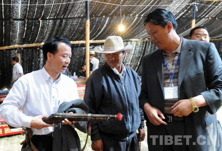 這是時任那曲縣縣長扎南(右)與中石化首批援藏干部李一超(左)在那曲賽馬會的大“黑賬”里,正在交流牧民傳統(tǒng)火槍的使用方法(唐召明2009年8月12日攝)