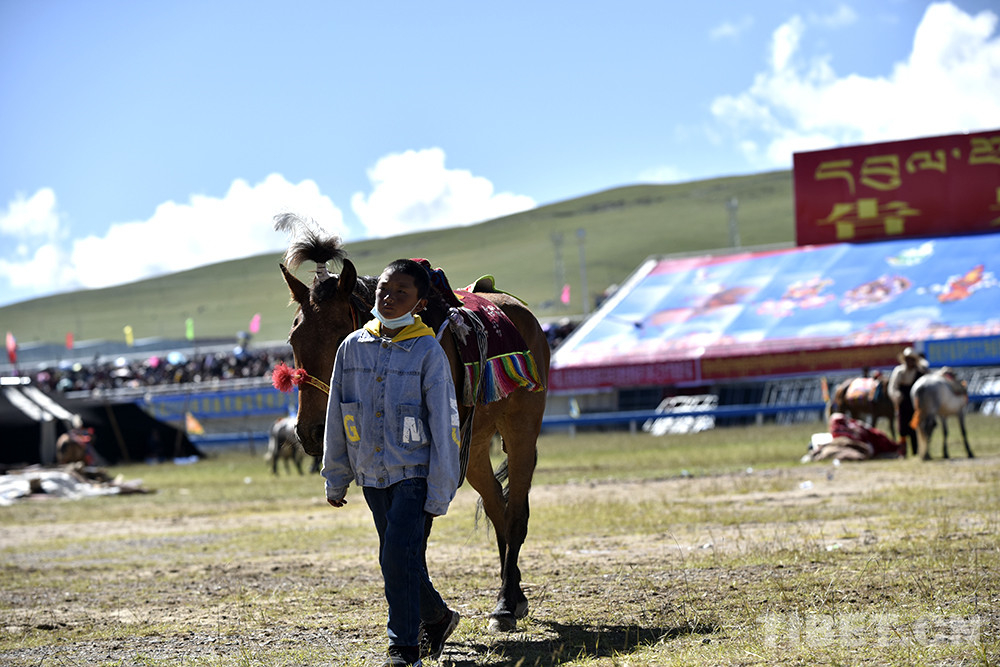 圖為西藏自治區(qū)那曲市2020羌塘恰青格薩爾賽馬藝術(shù)節(jié)場內(nèi)速度賽馬比賽現(xiàn)場,一位少年牽著馬兒 攝影:王媛媛