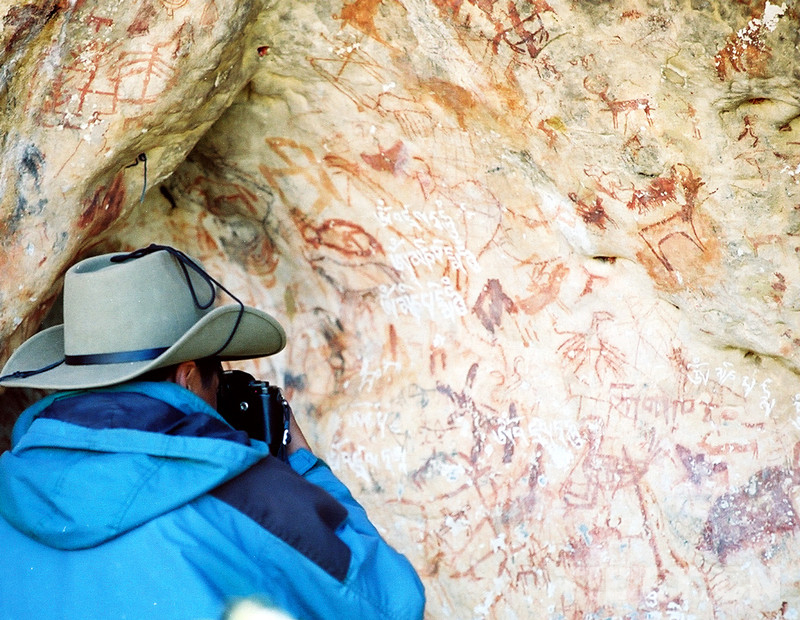 這是藏北高原無(wú)人區(qū)科考人員在考察溶洞巖畫(huà)(唐召明2001年攝)