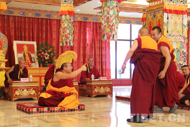 被主考官點(diǎn)名上場(chǎng)的考僧,身披黃色法衣,結(jié)跏趺坐于考場(chǎng)正中佛墊,屏氣凝神。提問(wèn)辯經(jīng)人員用“諦……”聲提示“舌戰(zhàn)”開(kāi)始,并在考場(chǎng)上來(lái)回走動(dòng)間口若懸河、滔滔不絕,即興向考僧提問(wèn)。提問(wèn)過(guò)程中,辯經(jīng)人員常會(huì)借助各種手勢(shì)來(lái)增強(qiáng)辯論的力度。如右手甩念珠,快速跨步向前,高舉右手,用力擊掌,聲如裂石,令人振奮。考僧必須集中精力,意志堅(jiān)定,沉著應(yīng)戰(zhàn)。不得不說(shuō),雙方常會(huì)言辭激烈,爭(zhēng)辯得面紅耳赤,這種情況下,仍能夠從容不迫、應(yīng)答得體的佼佼者才能得到認(rèn)可,脫穎而出。