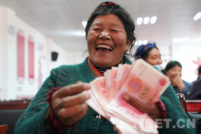 令人激動的時刻來臨了?!岸M索朗曲珍,分紅26739元;二組支張,分紅6495元;一組朗杰曲珍,分紅2668元……”社員們三步并作兩步,滿臉喜滋滋地依次上臺接過沉甸甸的分紅。他們在分紅發(fā)放清單上填上名字,摁上手印后,喜笑顏開地數著手里的錢。