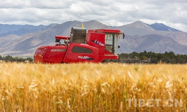 圖為收割機(jī)在青稞田里進(jìn)行機(jī)械化作業(yè) 攝影:趙耀