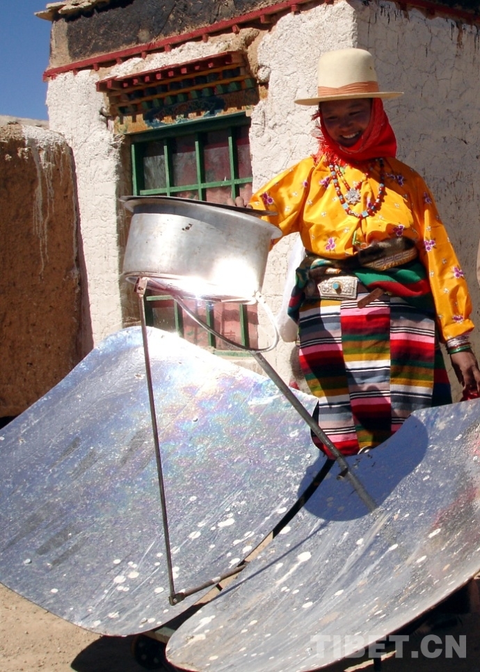 在藏北高原,現(xiàn)在隨處可見城鎮(zhèn)里的一個個太陽能路燈、一棟棟太陽能采暖樓和采暖房,一排排房頂上斜立著的太陽能熱水器,就連牧民家也常??梢钥吹桨卜旁诖扒啊⑽蓓敽驮簝?nèi)的電池板、太陽灶。利用太陽能燒水做飯和發(fā)電照明,既方便又干凈,老天爺還不收燃料費。