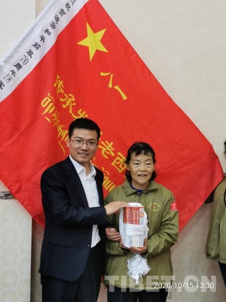 圖為原十八軍52師副政委、西藏自治區(qū)黨委原第一書(shū)記陰法唐中將之女陰建白代表父親向波密紅樓捐贈(zèng)紅色書(shū)籍