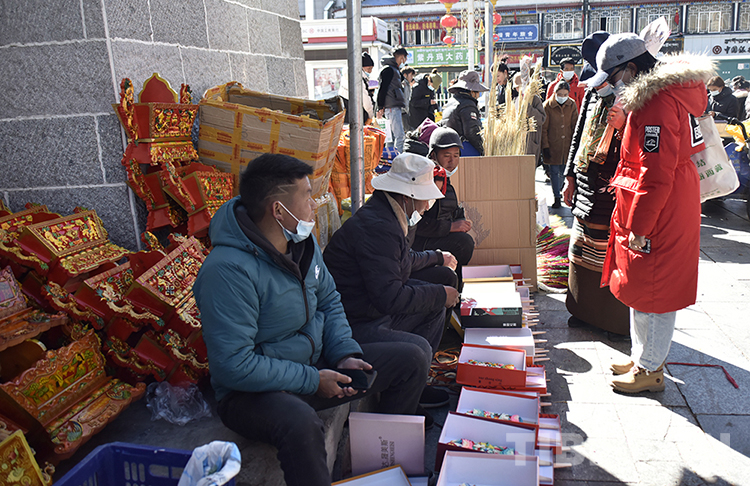 “阿佳,‘孜卓’要嗎?自己做的?!?月9日,記者在八廓商城走訪年貨市場(chǎng)時(shí),遇上了來自日喀則市仁布縣普松鄉(xiāng)的頓旦和他的同伴們。四個(gè)人在八廓商城外的巷子邊擺了十多對(duì)酥油花,招攬生意。遇上過往人群多瞧一眼,他們總是耐心地揭開盛放酥油花的鞋盒蓋,期待著多賣出一對(duì)酥油花。