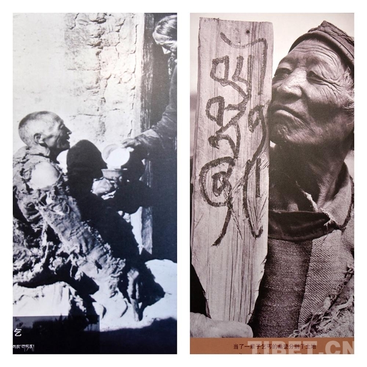 圖為拼圖照片,左圖為桑登求乞,右圖為桑登分到土地 翻拍自西藏百萬農奴解放紀念館