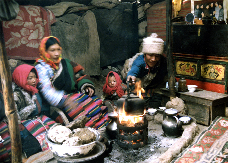 這是藏北尼瑪縣卓瓦鄉(xiāng)一戶牧民人家,在帳篷里圍著牛糞火爐燒茶取暖,其樂(lè)融融(唐召明1989年冬攝)