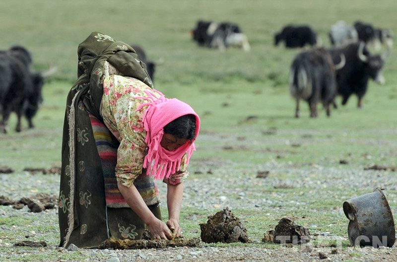 這是一位藏北申扎縣牧女正在草原上攤曬所撿拾的牛糞 (唐召明2009年8月9日攝)