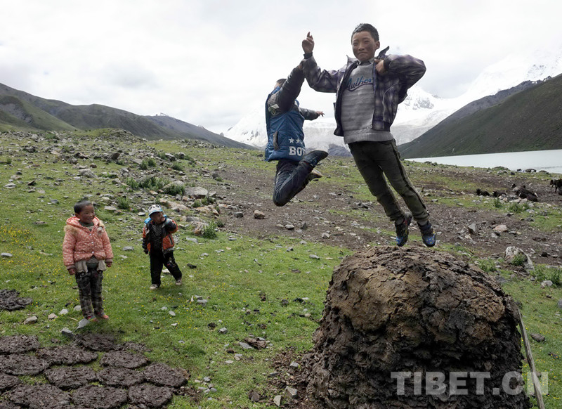 這是藏北比如縣兒童在自家牛糞垛上蹦跳玩耍(唐召明2014年7月10日攝)