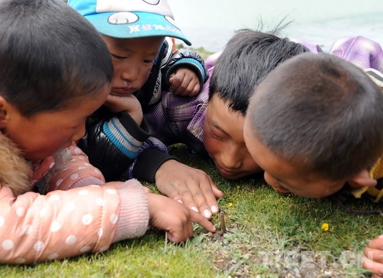 圖為藏北薩普冰川下的草地上,幾名兒童在觀察一根發(fā)現(xiàn)的蟲草(唐召明2014年7月10日攝)