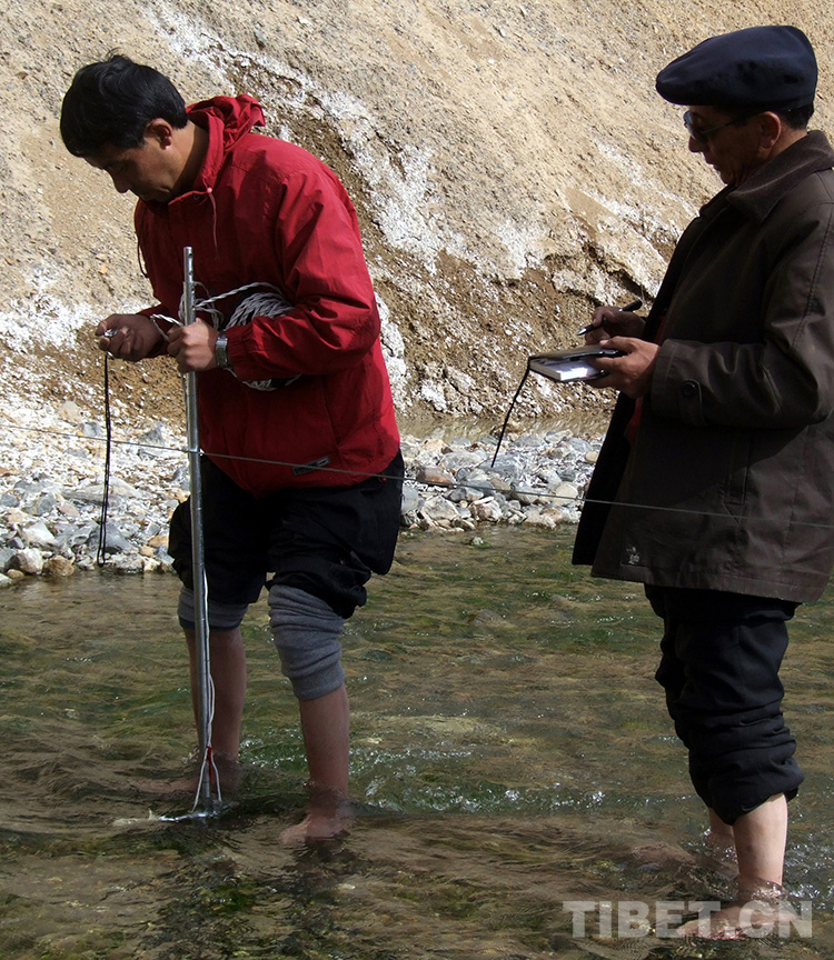 這是時(shí)任雙湖特別區(qū)副區(qū)長(zhǎng)王暉(左)和區(qū)委書記珠巨(右)在測(cè)量建設(shè)中的水電站流速(王暉提供,2007年攝)
