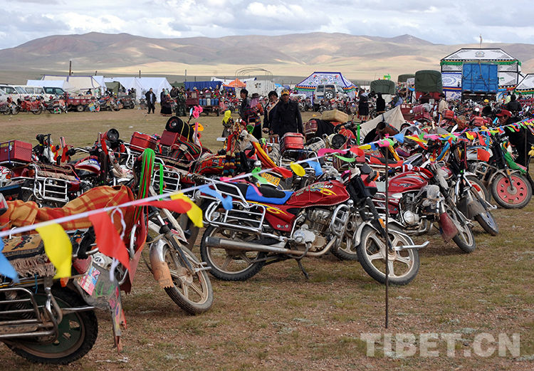 這是在雙湖“撤區(qū)建縣”慶?;顒?dòng)上,許多牧民騎著自家摩托車遠(yuǎn)道而來(唐召明2013年7月26日攝)