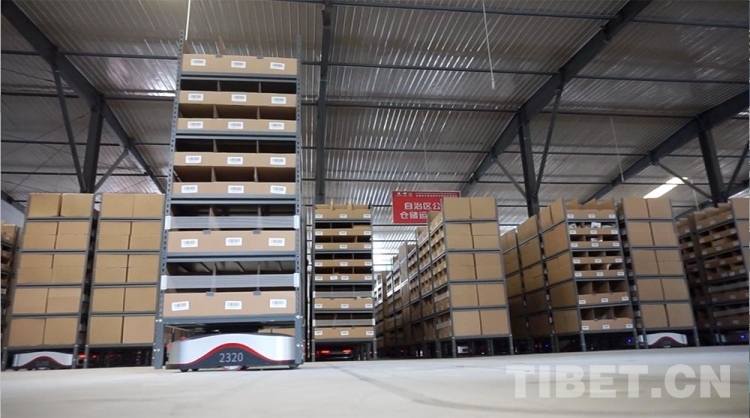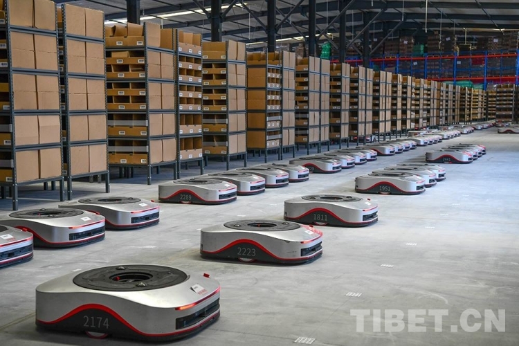 圖為西藏自治區(qū)級(jí)公共物流倉儲(chǔ)配送中心里,搬運(yùn)型機(jī)器人“地狼”正在工作