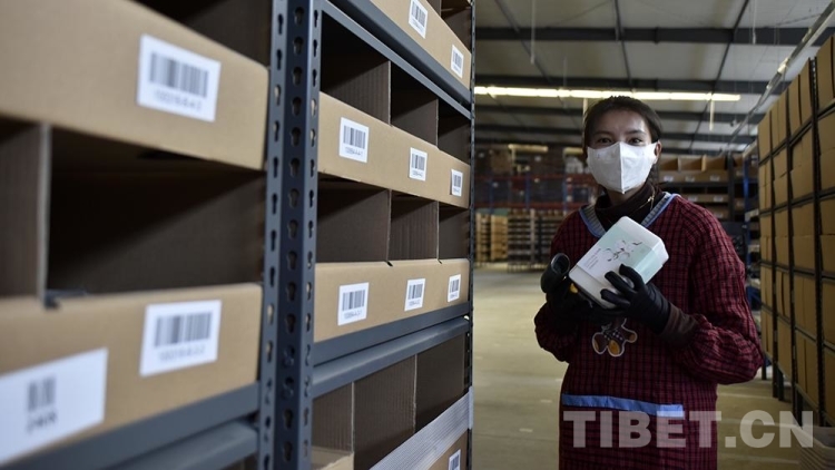 圖為西藏自治區(qū)級(jí)公共物流倉儲(chǔ)配送中心里,作業(yè)人員將搬運(yùn)型機(jī)器人“地狼”載來的貨架上的貨物取出