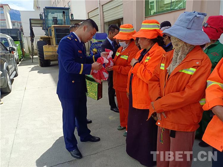 圖為消防指戰(zhàn)員向環(huán)衛(wèi)工人送上節(jié)日的祝福