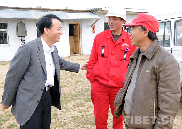 這是李一超(左)從北京來(lái)到班戈縣看望中國(guó)石化援建工程的施工人員(唐召明2009年8月11日攝)